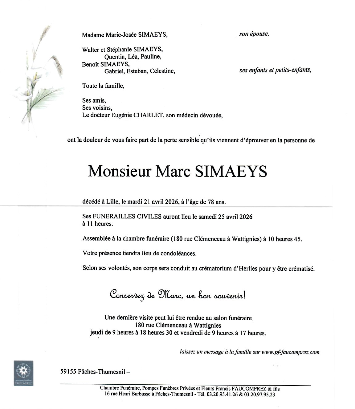 salon funéraire 180 rue Clemenceau à Wattignies